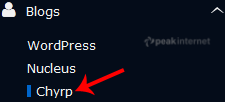 4.  On the left side of your screen you should locate the "Blogs" category. Click on it and then click on the "Chyrp" link that will appear.