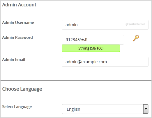 8. Under the "Admin Account" field enter the following information: