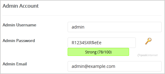 7. Under the "Admin Account" field enter the following information: