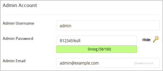8. Under the "Admin Account" field enter the following information: