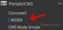 4. On the left side of your screen you should locate the "Portal/CMS" category. Click on it and then click on the "MODX" link that will appear.